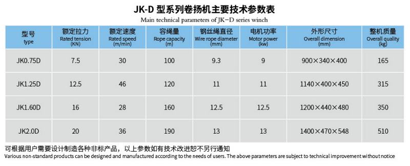 JK-D型系列卷揚機是采用少齒差行星傳動的新型卷揚機,是目前傳統卷揚機更新換代的理想產品。它具有結構緊湊、運行平穩(wěn)、操作方便、維護簡單、低噪音、使用壽命長等優(yōu)點。廣泛應用于建筑施工、碼頭、橋梁、冶金等行業(yè)的起重與安裝。