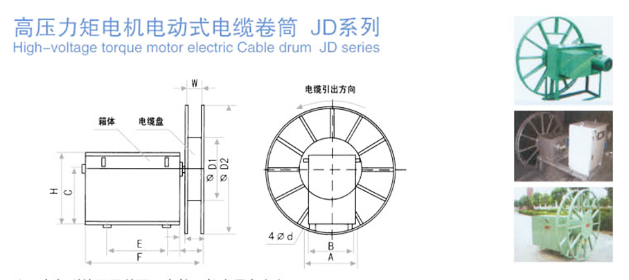 應用:JD 系列電動卷筒是以力矩電機為動力,卷取力大。適用于電纜(軟管)較重移動距離較長的工況。